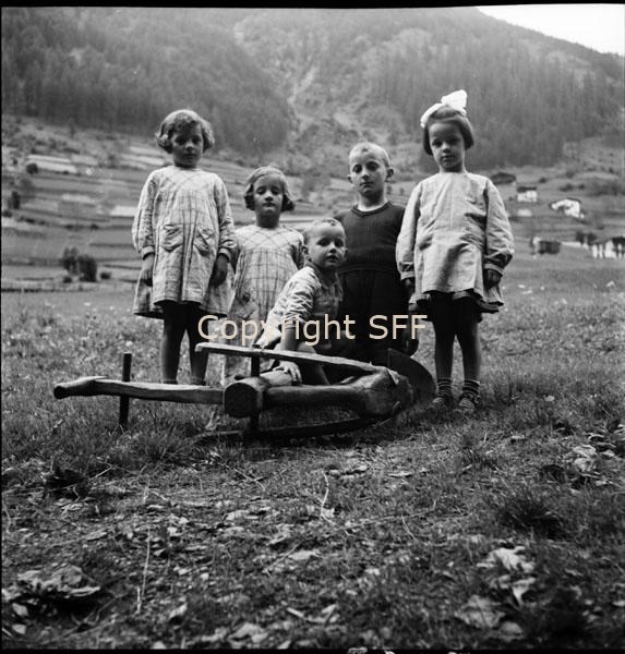 Bambini in posa con un aratro ripreso a terra dalla parte posteriore
