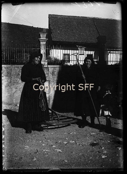 Due donne reggono un bloccaggio per corda da fieno, una punta da fieno e sono ritratte accanto ad una slitta chiamata grap: specie di traino o slitta, utilizzata per il trasporto di fasci di fieno o legna