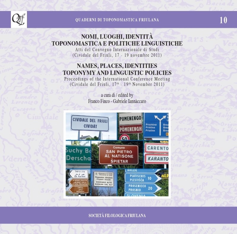 : atti del Convegno internazionale di studi : (Cividale del Friuli, 17-19 novembre 2011) = Names, places, identities toponymy and linguistic policies : proceedings of the International conference meeting : (Cividale del Friuli, 17-19 november 2011) / a cura di = edited by Franco Finco, Gabriele Iannàccaro. - Udine : Società Filologica Friulana, 2014. - 338 p. : ill. ; 22x22 cm. - (Quaderni di toponomastica friulana ; 10)