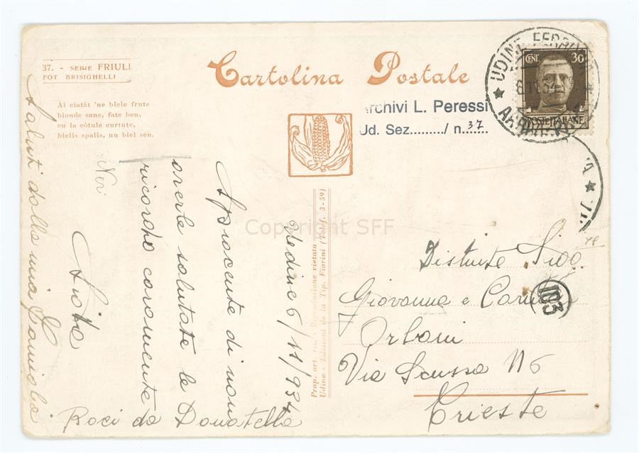 Cartolina viaggiata. Ritratto di una donna in costumi tradizionali carnici ripresa mentre posa seduta su un prato, sullo sfondo un paesaggio montano. Documentazione del patrimonio etnoantropologico