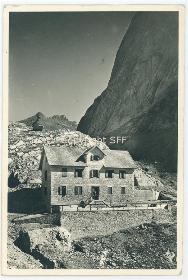 Veduta del Rifugio alpino Lambertenghi e Romanin a Passo Volaia.