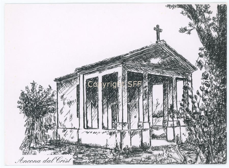 Stampa tipografica su disegno di Bruno Fritsch raffigurante edificio di culto intitolato al Cristo
