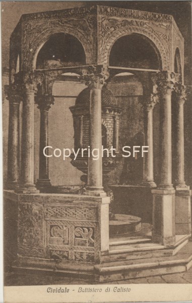 Il Fonte battesimale del patriarca Callisto (737-756). Presenta una forma ottagonale ed è sormontato da un tegurio, composto da ampi archi a tutto sesto, sostenuto da colonne corinzie. La sua altezza è di 354 cm ed è realizzato in calcare bianco. Gli archi sono adornati da iscrizioni e da motivi vegetali, animali e geometrici, mentre nella parte bassa è decorato da due lastre scolpite molto simili all'altare del duca Ratchis. Le figure simboliche rappresentate sono legate al sacramento del battesimo (pavoni e grifoni alla fonte, leoni ed agnelli, simboli cristologici e degli Evangelisti). L'opera, espressione della rinascenza liutprandea, presenta modelli ed influssi classici, paleocristiani ed orientali.