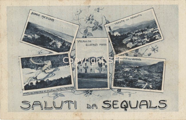 Scorci del paese: borgo Meduna, la villa del sig. Gustavo Mora; il ponte sul fiume Meduna e una veduta