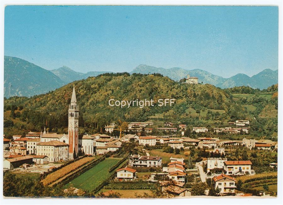 Panorama sull'abitato di Buia, a sinistra la Chiesa di Santo Stefano protomartire. Al centro si trova il Monte di Buja, una collina di 324 metri di altezza che risulta essere una delle più elevate della zona.