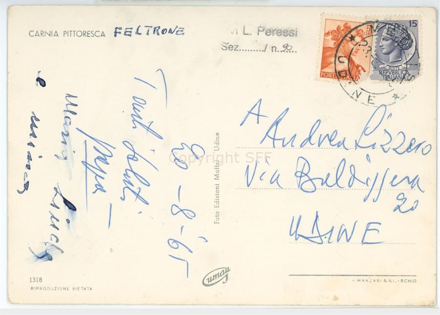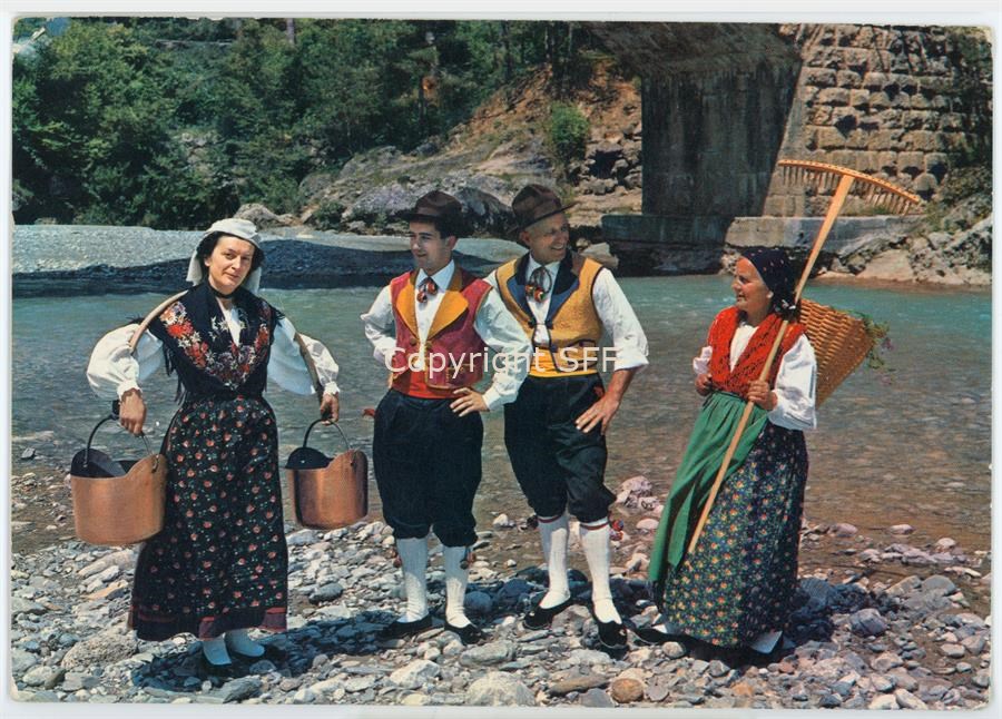 Cartolina viaggiata. Ritratto di gruppo in esterno. Donne e uomini in abiti della tradizione friulana ripresi lungo il greto di un fiume. Documentazione del patrimonio etnoantropologico