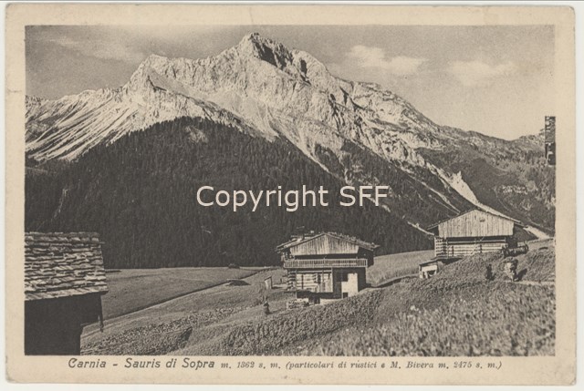 Carnia - Sauris di Sopra m. 1362 s. m. (particolari di rustici e M. Bivera m. 2475 s. m.)