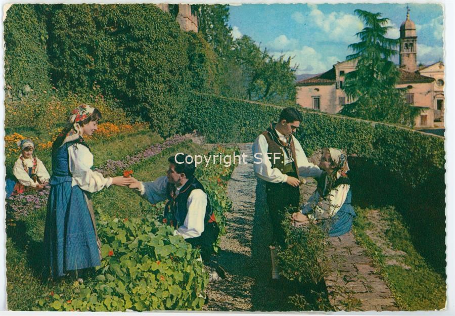 Ritratto di gruppo. Donne e uomini in costumi tradizionali carnici ripresi mentre raccolgono fiori nei giardini lungo le mura del Castello di Colloredo di Monte Albano. Documentazione del patrimonio etnoantropologico