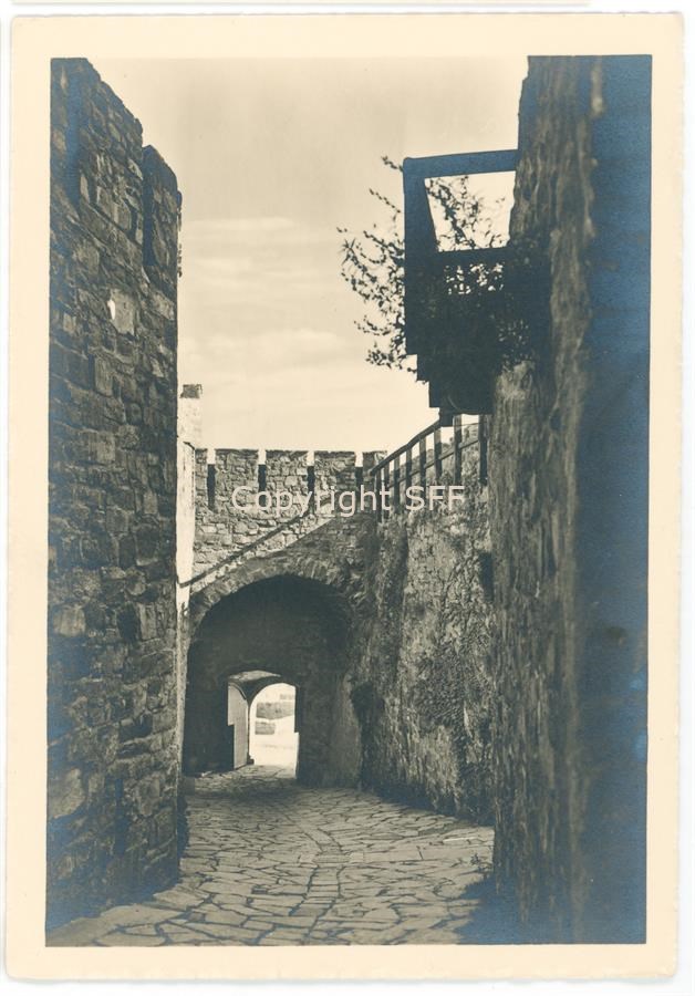 Veduta di un ambiente di passaggio del Castello di Gorizia. L'edificio, dopo i bombardamenti che avevano danneggiato la fortificazione medievale durante il primo conflitto mondiale, venne restaurato dal Soprintendente Ferdinando Forlati fra il 1934 e il 1937.
