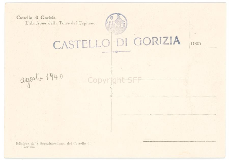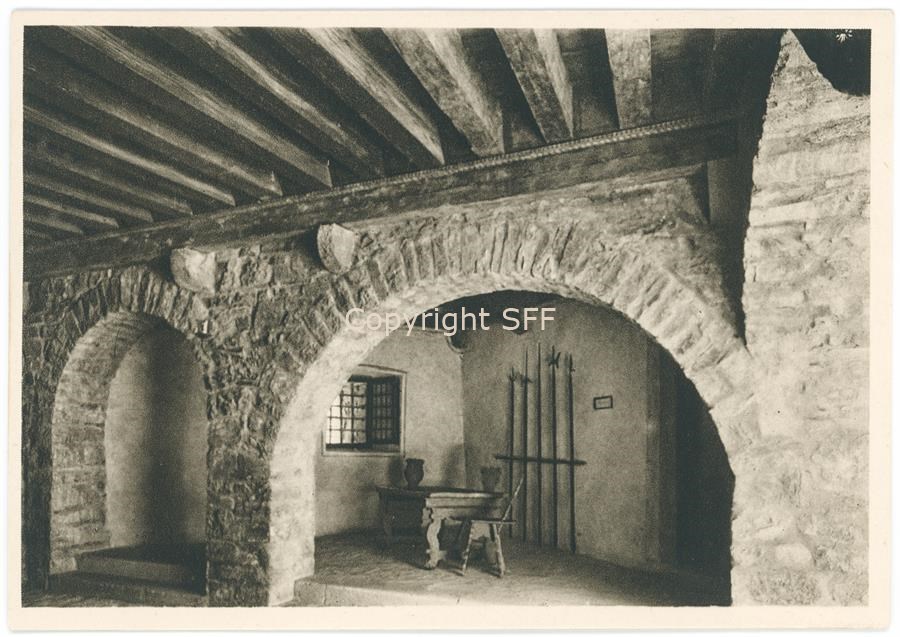 Interno di un ambiente del Castello di Gorizia. L'edificio, dopo i bombardamenti che avevano danneggiato la fortificazione medievale durante il primo conflitto mondiale, venne restaurato dal Soprintendente Ferdinando Forlati fra il 1934 e il 1937.