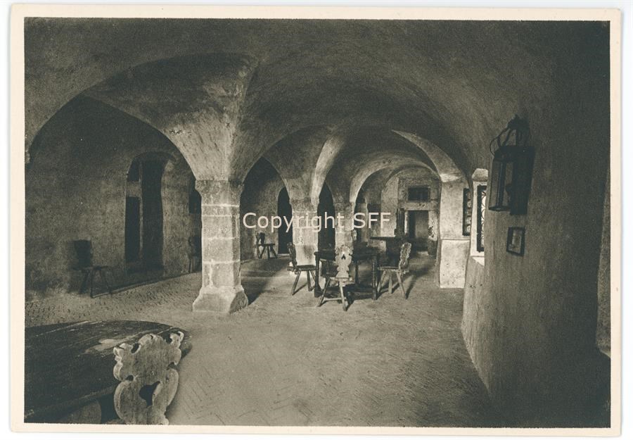 Interno di un ambiente del Castello di Gorizia. L'edificio, dopo i bombardamenti che avevano danneggiato la fortificazione medievale durante il primo conflitto mondiale, venne restaurato dal Soprintendente Ferdinando Forlati fra il 1934 e il 1937.