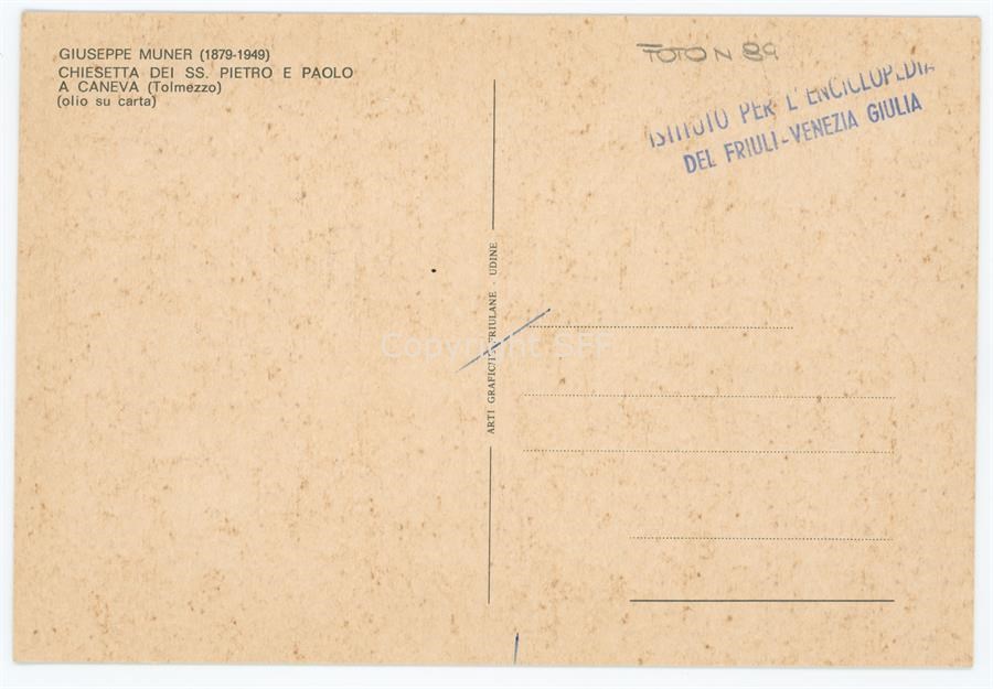 La chiesa dei Santi Pietro e Paolo a Caneva di Tolmezzo qui ritratta con la tecnica ad olio dal pittore Giuseppe Muner (1879-1949). Eretta tra la fine del settecento e gli inizi dell’ottocento come stazione rogazionale è orientata a nord con aula rettangolare di piccole dimensioni. Subì importanti lesioni con il terremoto del 1976, successivamente venne ristrutturata.