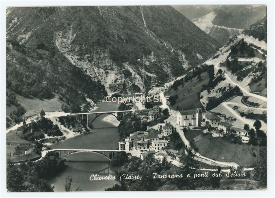 Panorama su Chievolis, in comune di Tramonti di Sopra. La località attraversata dal fiume Silisia, a carattere torrentizio, è collegata da due ponti. Il terremoto del 1976 provocò ingenti danni