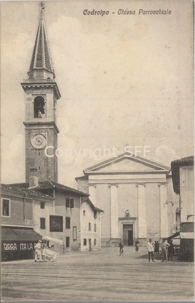 La piazza e sullo sfondo la Chiesa Parrocchiale con il relativo campanile di Codroipo