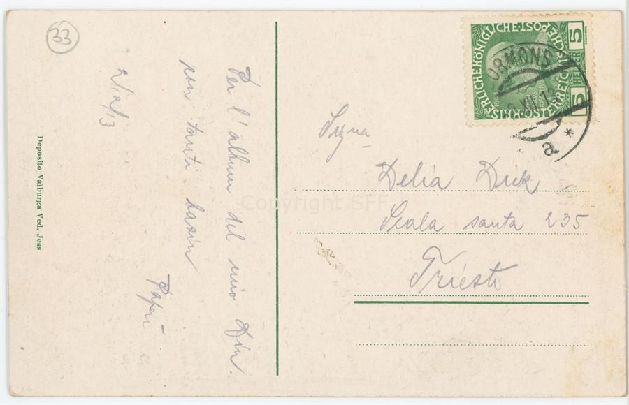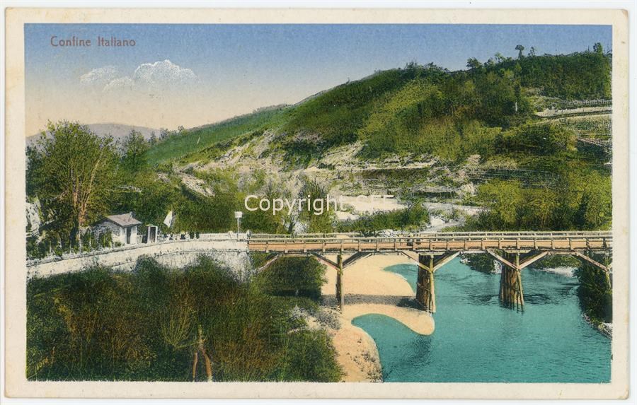 Cartolina viaggiata a colori che raffigura il vecchio confine italiano nei pressi del ponte sull'Judrio [Iudrio]. Brazzano fu un valico di frontiera tra Austria-Ungheria e Italia