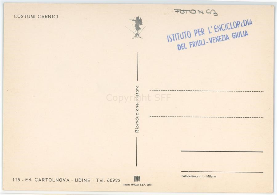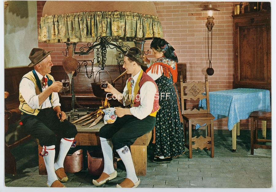 Ritratto di gruppo in costumi carnici, interno. Due uomini brindano con un bicchiere di vino rosso, dietro a loro una donna è impegnata a mescolare la polenta che si sta cucinando sulla fiamma viva del camino. Il fogolâr era il cuore dell'abitazione popolare friulana