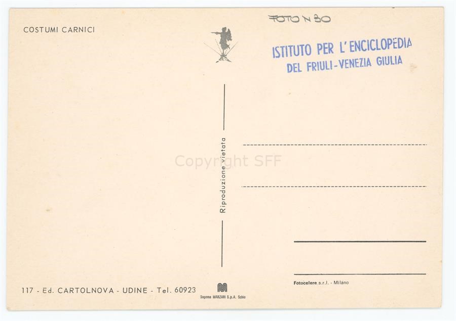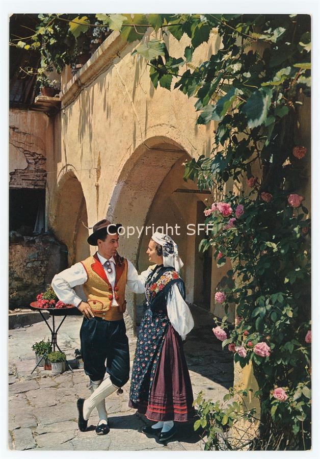Ritratto di una donna e un uomo in costumi carnici in posa in una corte