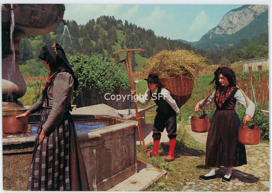 Ritratto di un gruppo di donne e uomini in costumi tradizionali carnici ripresi nei pressi di una fontana. Documentazione del patrimonio etnoantropologico