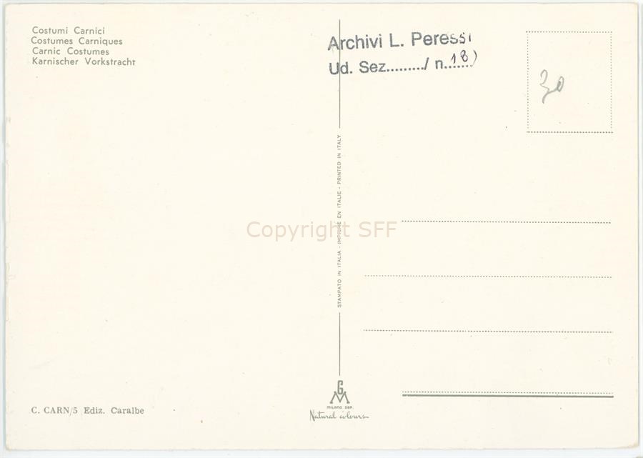 Ritratto in esterno di un gruppo di giovani in costumi tradizionali carnici ripresi nel sentiero, ornato di statue in pietra, che corre lungo le mura del giardino fiorito di un palazzo . Documentazione del patrimonio etnoantropologico