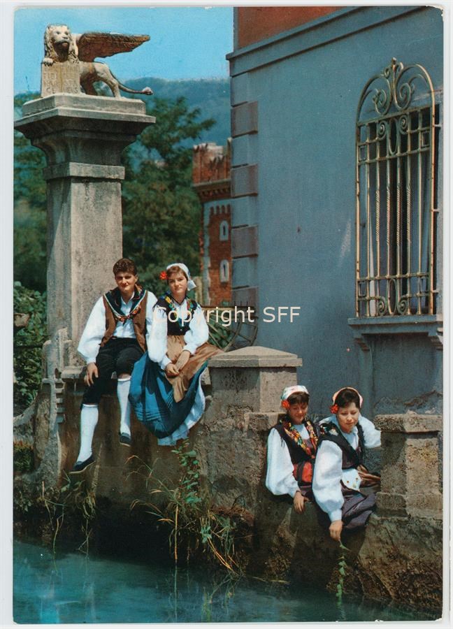 Ritratto di gruppo di donne e uomini in costumi tradizionali carnici ripresi lungo il corso di una roggia. A delimitazione del corso d'acqua il leone marciano in pietra a tutto tondo reggente il libro aperto con la consueta scritta, di probabile fattura ottocentesca. Documentazione del patrimonio etnoantropologico