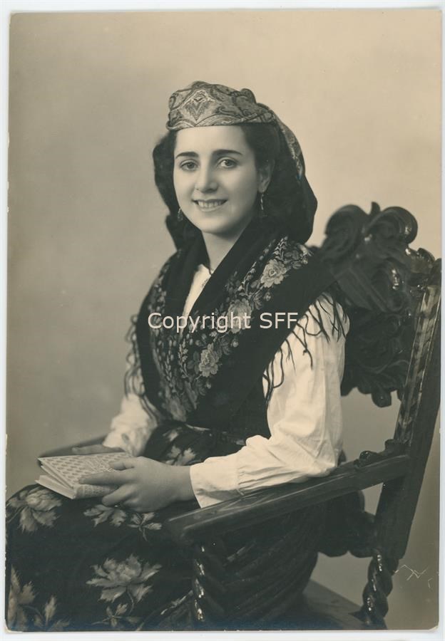 Ritratto in studio di una giovane donna in costumi tradizionali carnici ripresa con un libro in mano. Documentazione del patrimonio etnoantropologico