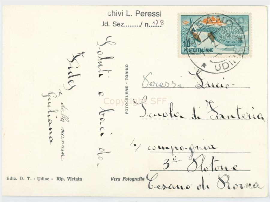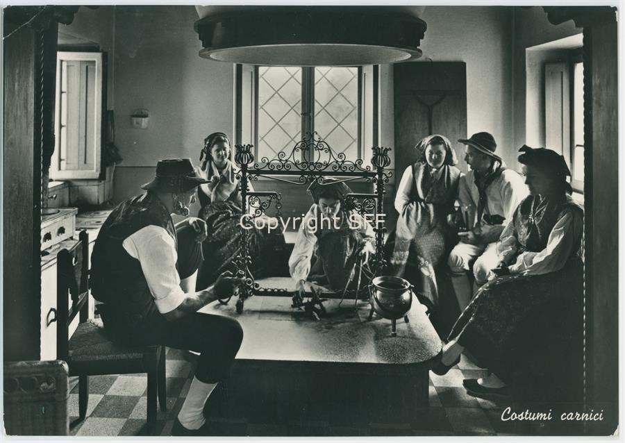 Cartolina viaggiata. Ritratto in interno di un gruppo di donne e uomini in costumi tradizionali carnici raccolti attorno al Fogolâr. Documentazione del patrimonio etnoantropologico