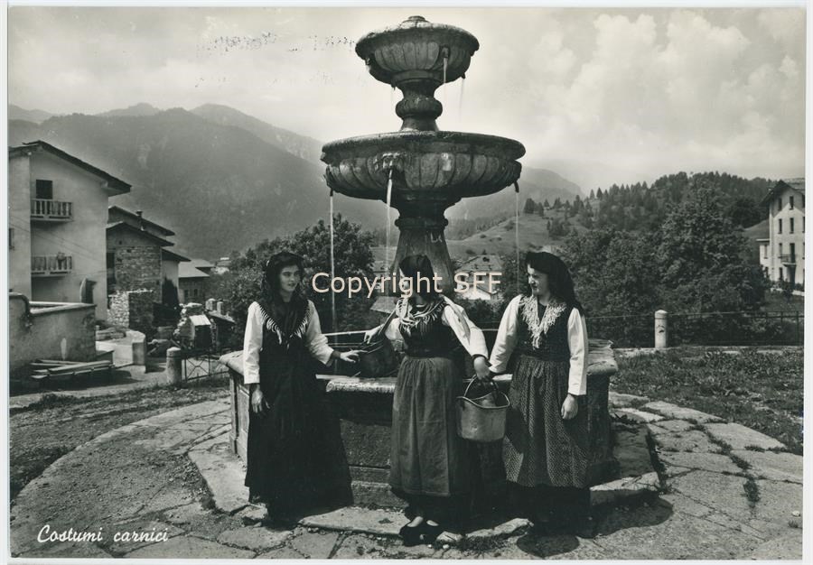 Ritratto di un gruppo di donne in costumi tradizionali carnici riprese attorno ad una fontana. Documentazione del patrimonio etnoantropologico
