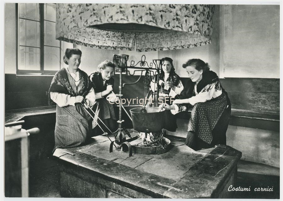 Ritratto in interno di un gruppo di donne in costumi tradizionali carnici riunite attorno al Fogolâr. Documentazione del patrimonio etnoantropologico