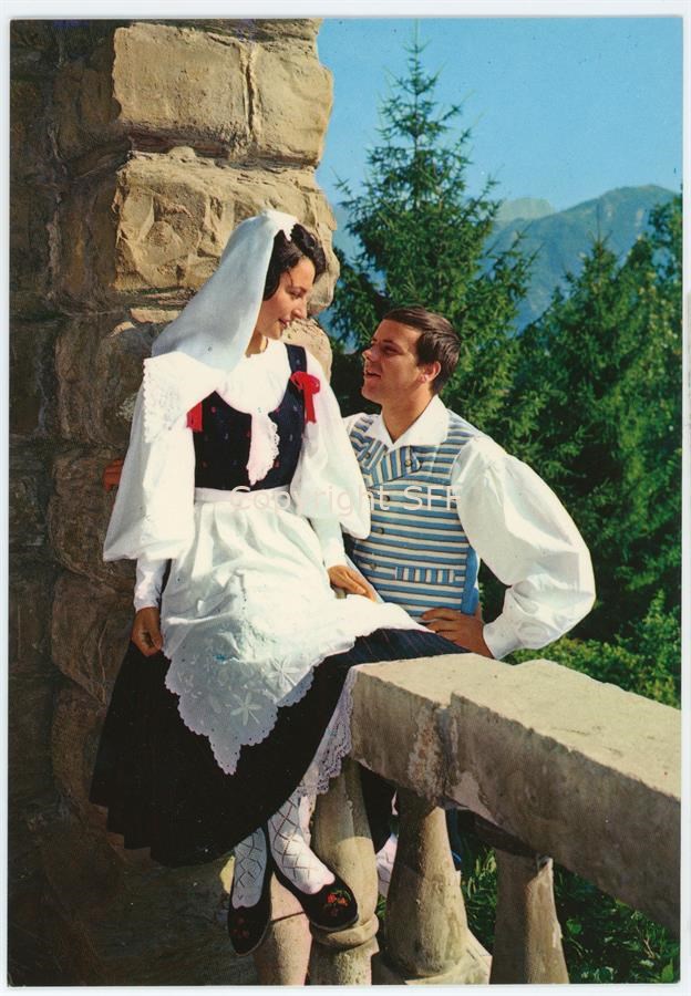 Ritratto in esterno una donna e un uomo in costumi tradizionali carnici, sullo sfondo un paesaggio montano. Documentazione del patrimonio etnoantropologico