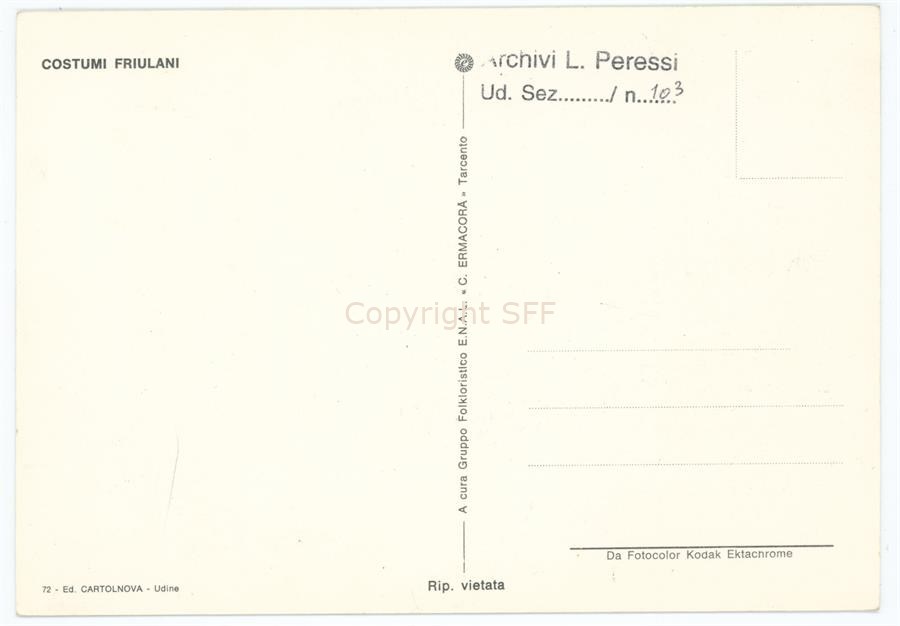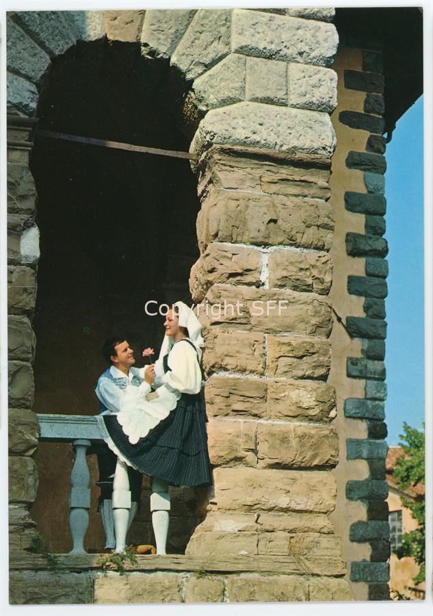 Ritratto in esterno una donna e un uomo in costumi tradizionali carnici, ripresi sotto un arco di un palazzo. Documentazione del patrimonio etnoantropologico