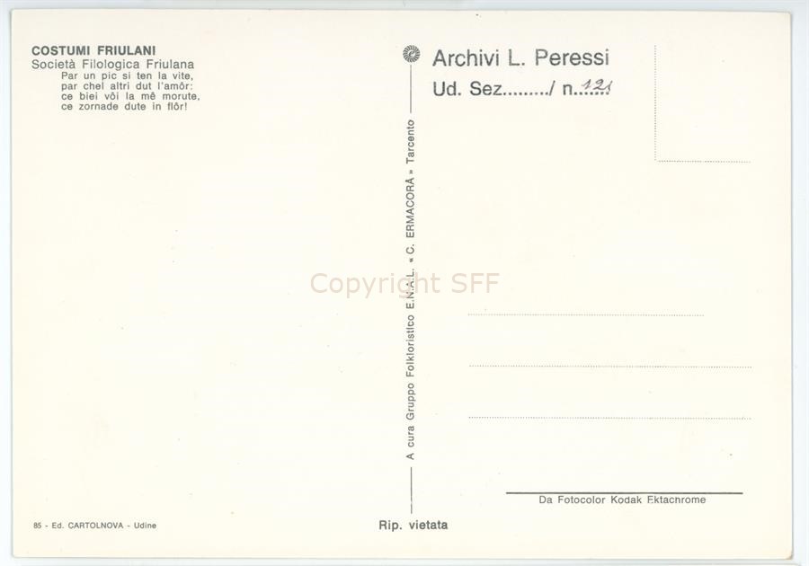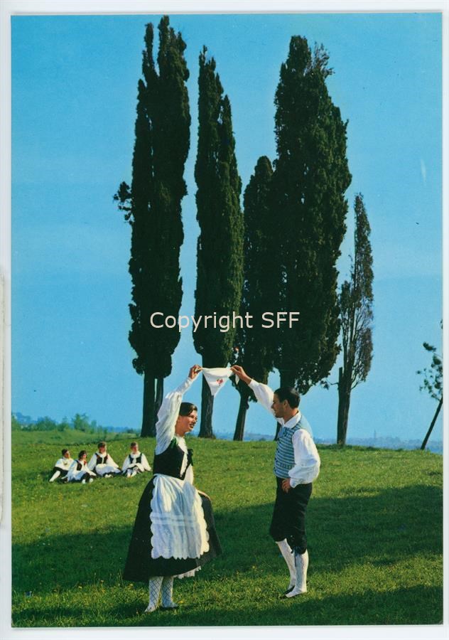 Ritratto di gruppo in esterno. In primo piano una donna e un uomo in costumi tradizionali carnici ripresi mentre danzano, sullo sfondo un gruppo di donne sedute sul prato. Documentazione del patrimonio etnoantropologico
