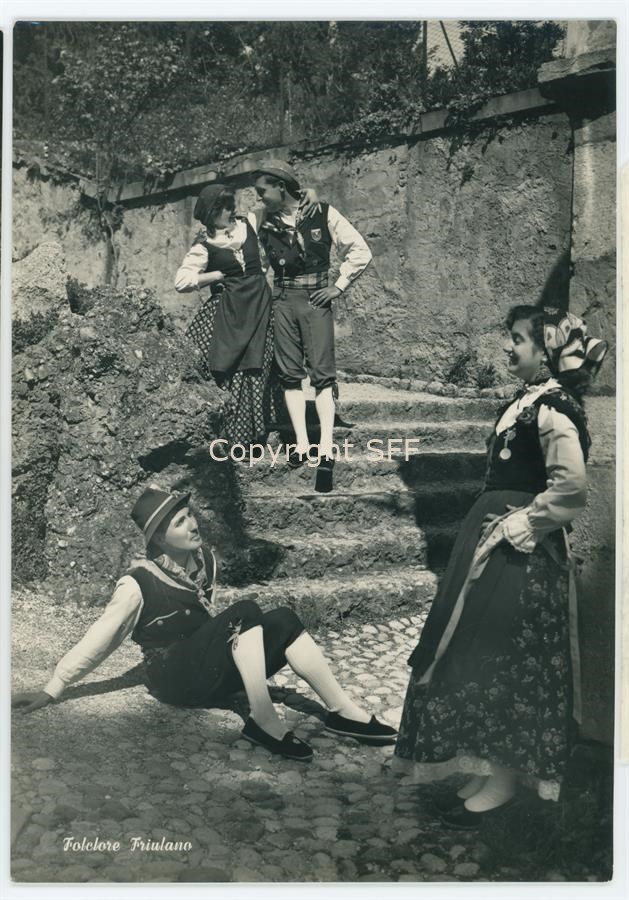 Ritratto, in esterno, a figura intera di due coppie, donna e uomo, in abiti della tradizione friulana. Documentazione del patrimonio etnoantropologico