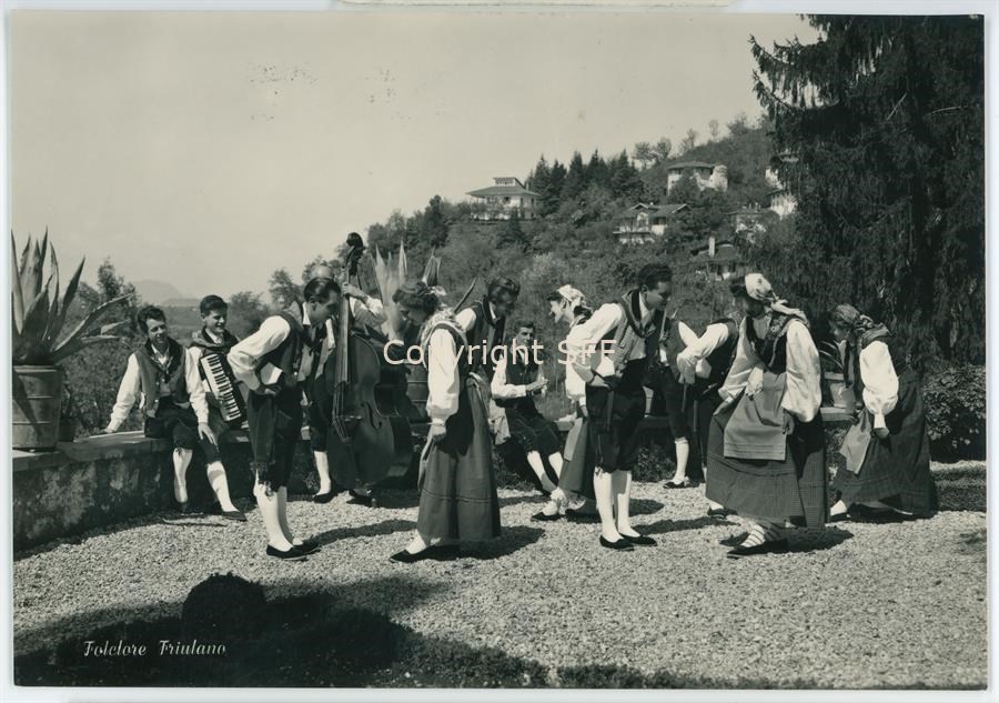 Ritratto di gruppo in esterno, a figura intera di donne e uomini, in abiti della tradizione friulana. Due musicisti suonano la fisarmonica e il contrabbasso, mentre il resto del gruppo danza. Documentazione del patrimonio etnoantropologico