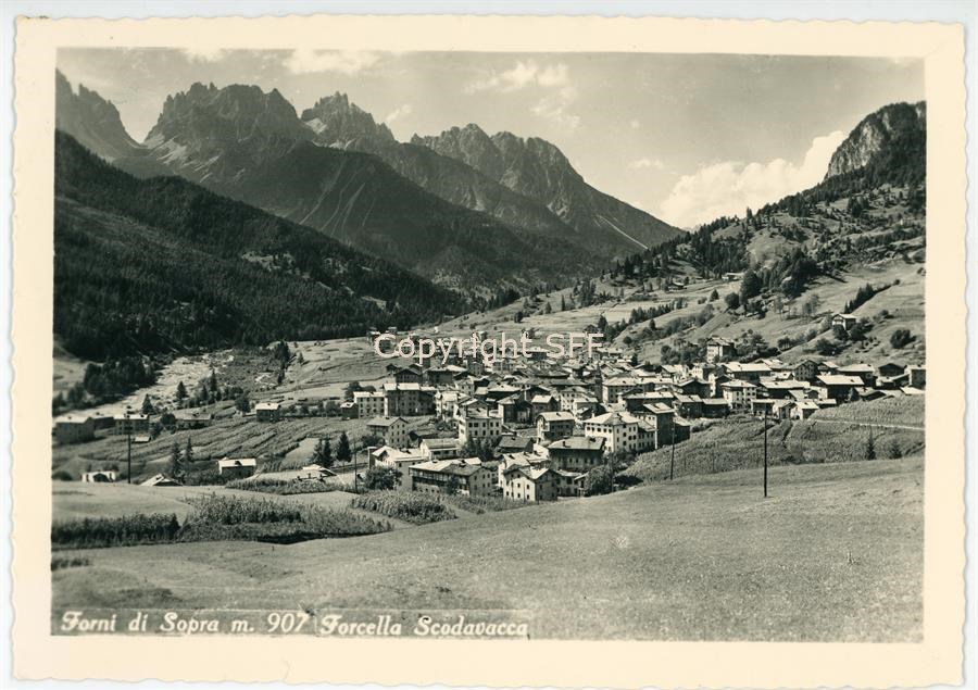 Panorama di Forni di Sopra sullo sfondo di Forcella Scodavacca.
