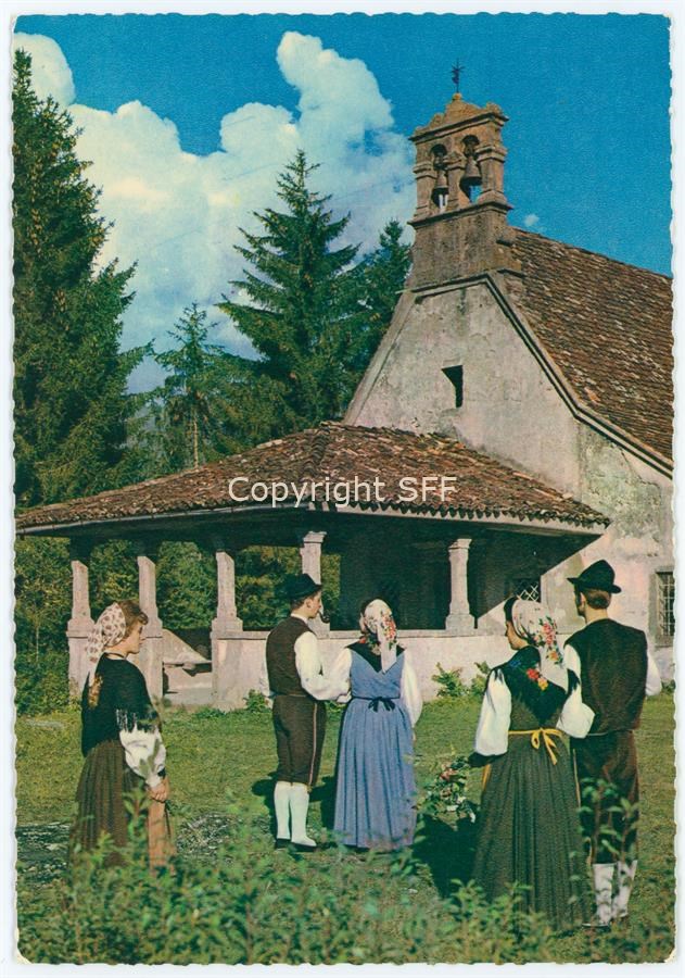 Ritratto di gruppo. Donne e uomini in costumi tradizionali carnici ripresi nei pressi della Chiesa di San Rocco ad Enemonzo. Documentazione del patrimonio etnoantropologico