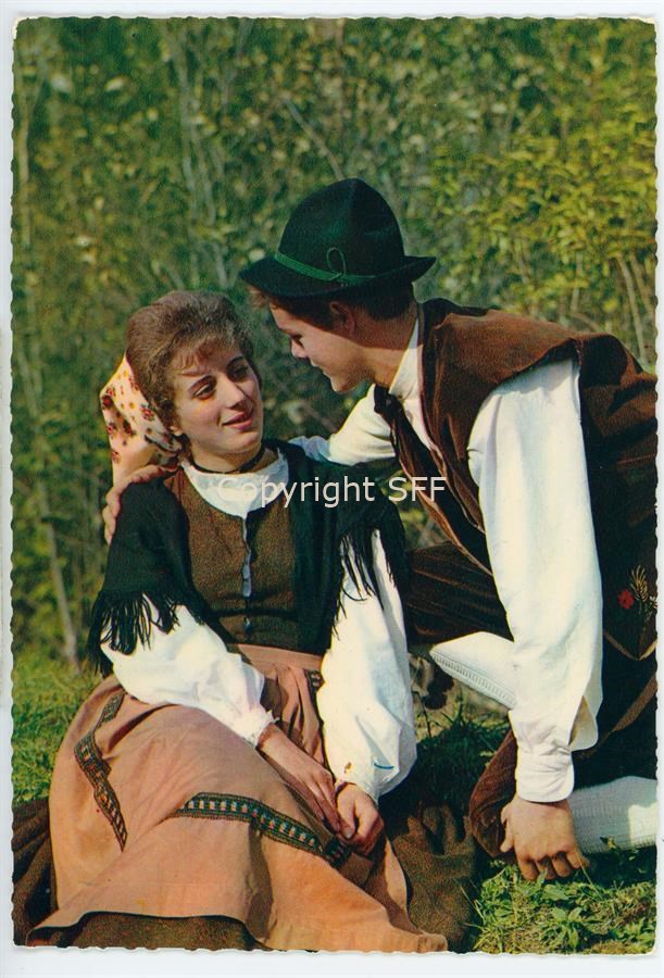 Ritratto di una donna e un uomo in costumi tradizionali carnici ripresi mentre posano nei prati della Val Fella. Documentazione del patrimonio etnoantropologico