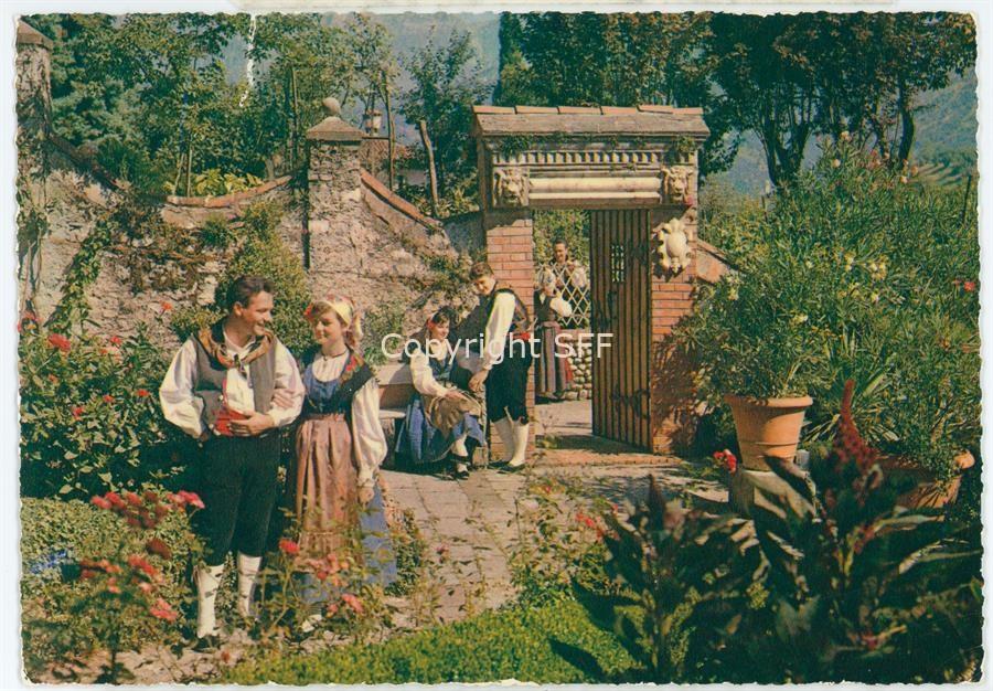 Ritratto di gruppo. Donne e uomini in costumi tradizionali carnici ripresi il un giardino fiorito. Documentazione del patrimonio etnoantropologico