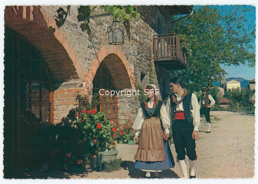 Ritratto di una donna e un uomo in costumi tradizionali carnici ripresi in una corte di un borgo. Documentazione del patrimonio etnoantropologico