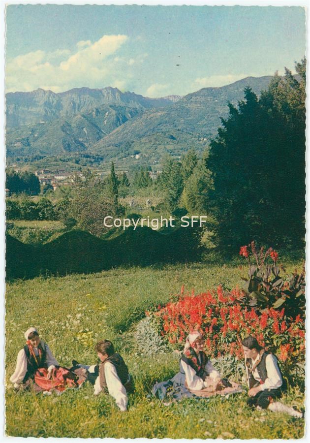 Ritratto di gruppo di donne e uomini in costumi tradizionali carnici ripresi tra le colline friulane. Documentazione del patrimonio etnoantropologico