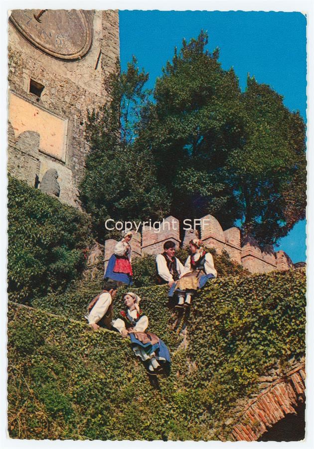 Ritratto di gruppo. Donne e uomini in costumi tradizionali carnici ripresi lungo le mura esterne del Castello di Colloredo di Monte Albano. Documentazione del patrimonio etnoantropologico