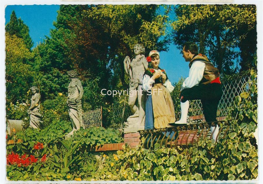 Ritratto di gruppo. Donne e uomini in costumi tradizionali carnici ripresi mentre raccolgono fiori nei giardini lungo le mura del Castello di Colloredo di Monte Albano. Documentazione del patrimonio etnoantropologico