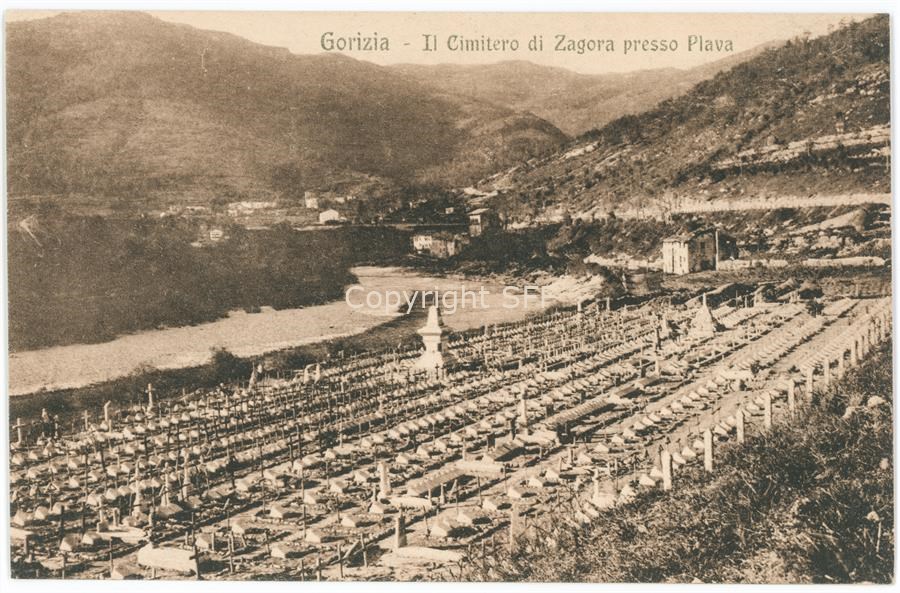 Veduta del Cimitero di guerra di Zagora (Plava, Canale d'Isonzo), aperto nel 1916 e riordinato nel 1923, prima della traslazione delle salme nel Sacrario di Oslavia; nel 1922, per disposizione testamentaria, vi era stata traslata la salma del generale Giovanni Prelli (1851-1919), e il camposanto aveva preso il suo nome.