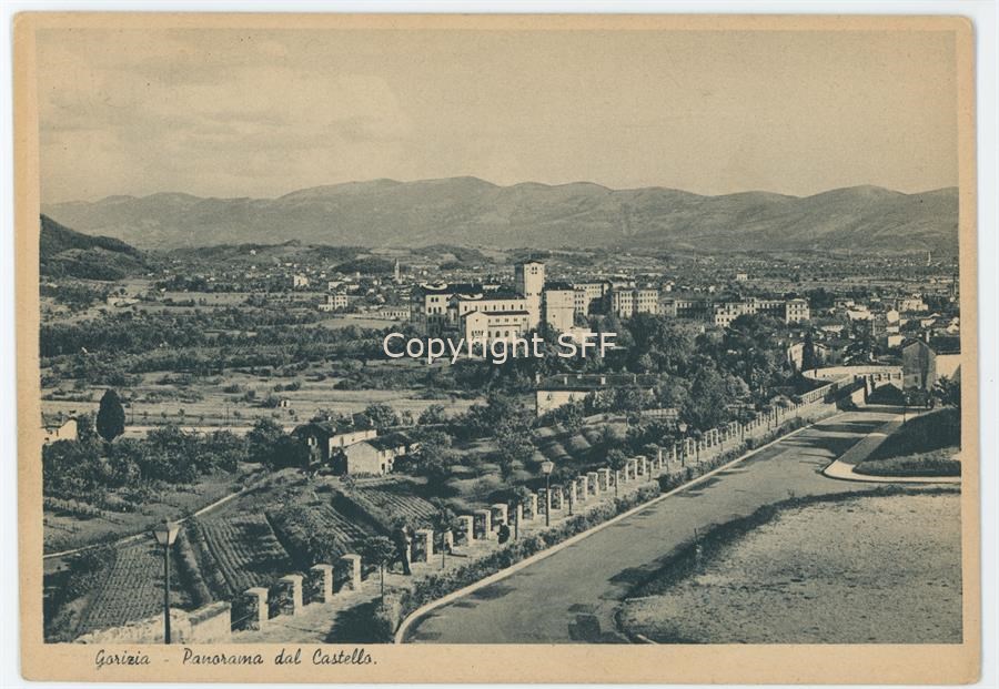 Panorama sulla città di Gorizia vista dal Castello. In primo piano il Seminario Minore, così detto non per le sue dimensioni ma perché destinato ad accogliere studenti delle classi inferiori rispetto a quelli del Seminario teologico centrale. Dal 1989 ospita una sede distaccata dell'Università degli Studi di Trieste