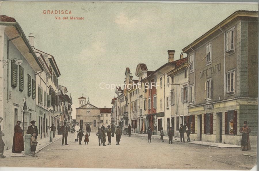 Edifici adibiti ad abitazioni, attività commerciali e gruppi di persone lungo la via del mercato