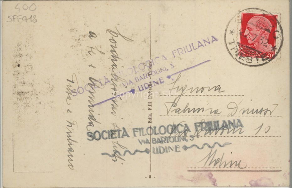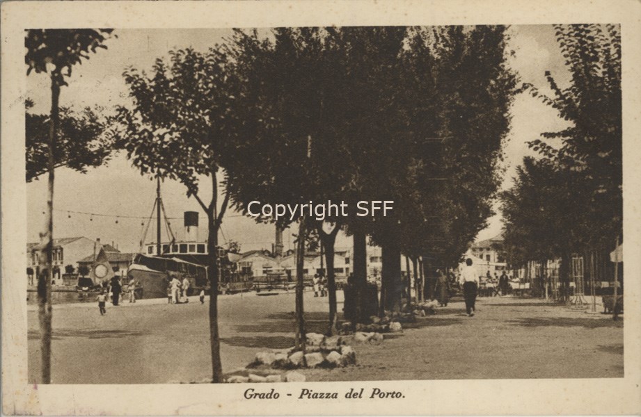 Viale alberato nei pressi della piazza del porto (attuale piazza XXIV maggio). Si intravedono anche imbarcazioni ormeggiate sulla sinistra.