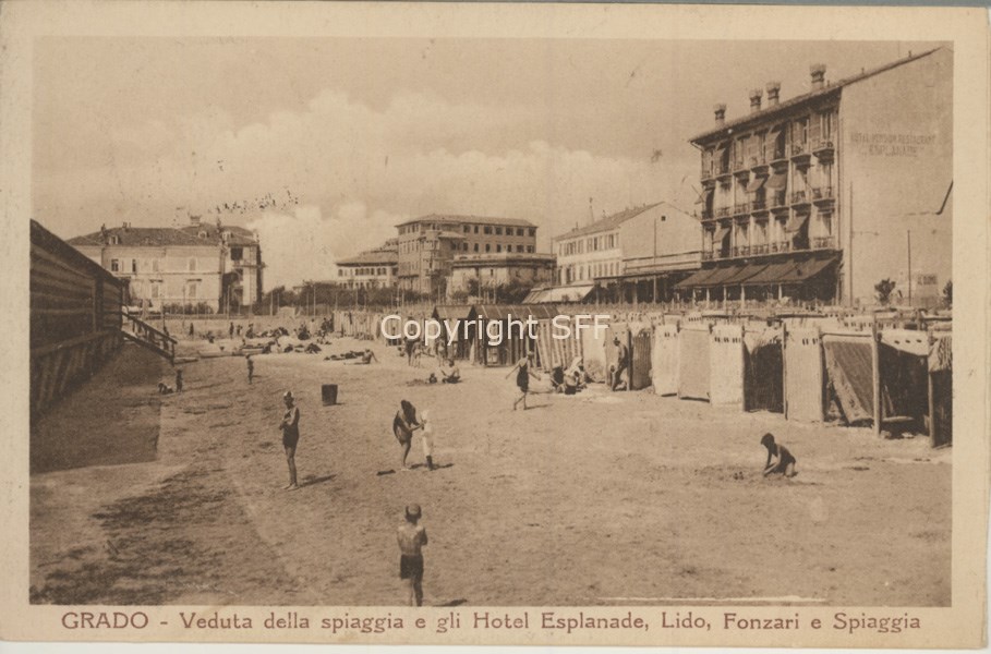 Grado - Veduta della spiaggia e gli Hotel Esplanade, Lido, Fonzari e Spiaggia