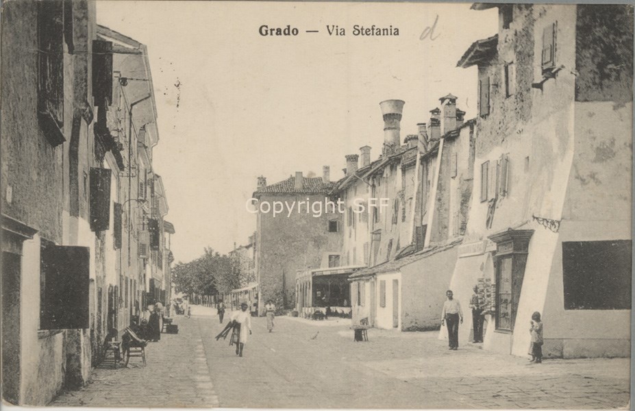 Abitazioni con tipici comignoli lungo via Stefania (attuale via Grado).