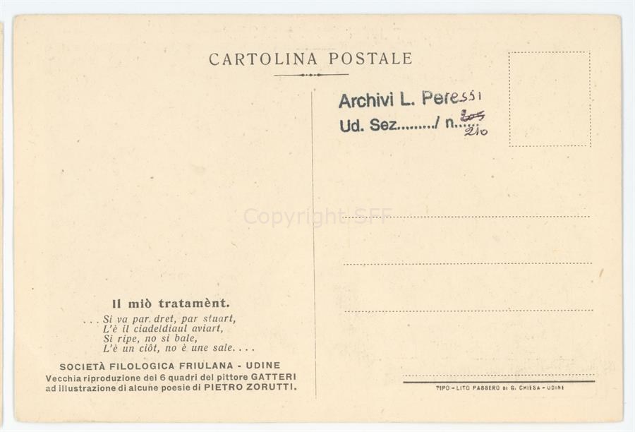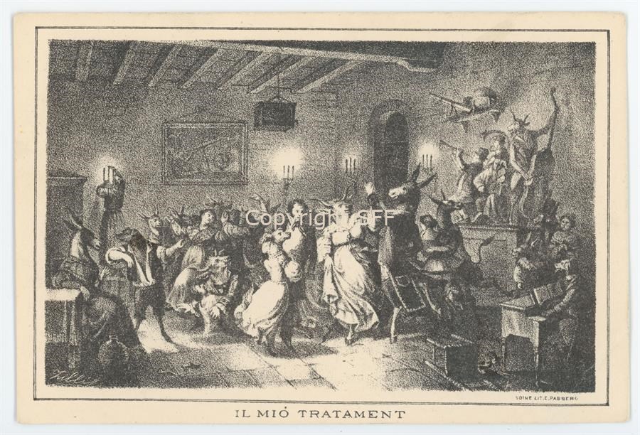 Riproduzione dell'opera dal titolo Il miò Tratamènt realizzata dal pittore triestino Giuseppe Lorenzo Gatteri, a metà dell'Ottocento, per illustrare sei poesie di Pietro Zorutti. La rappresentazione del Mùs fu uno dei motivi più fortunati dell’opera zoruttiana. Qui viene rappresentata una scena satirica. Il disegno realizzato dall'incisore Travani C. tra il 1851-1852