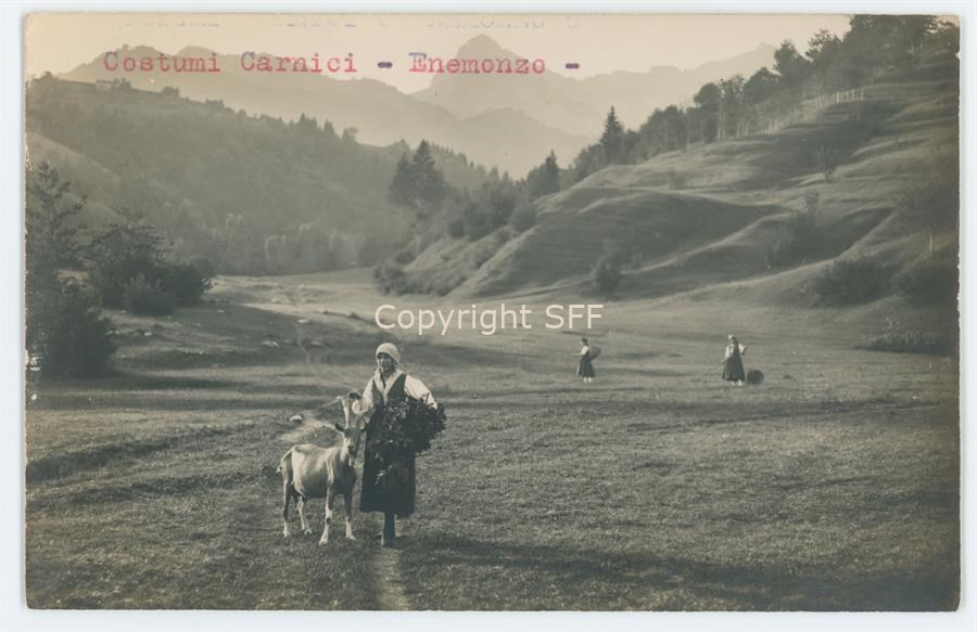 Ritratto di gruppo in esterno. Donne in costumi tradizionali carnici riprese con gli strumenti per la raccolta del fieno, falce e gerla sulle spalle. in primo piano una ragazza in posa accanto ad una capra. Documentazione del patrimonio etnoantropologico
