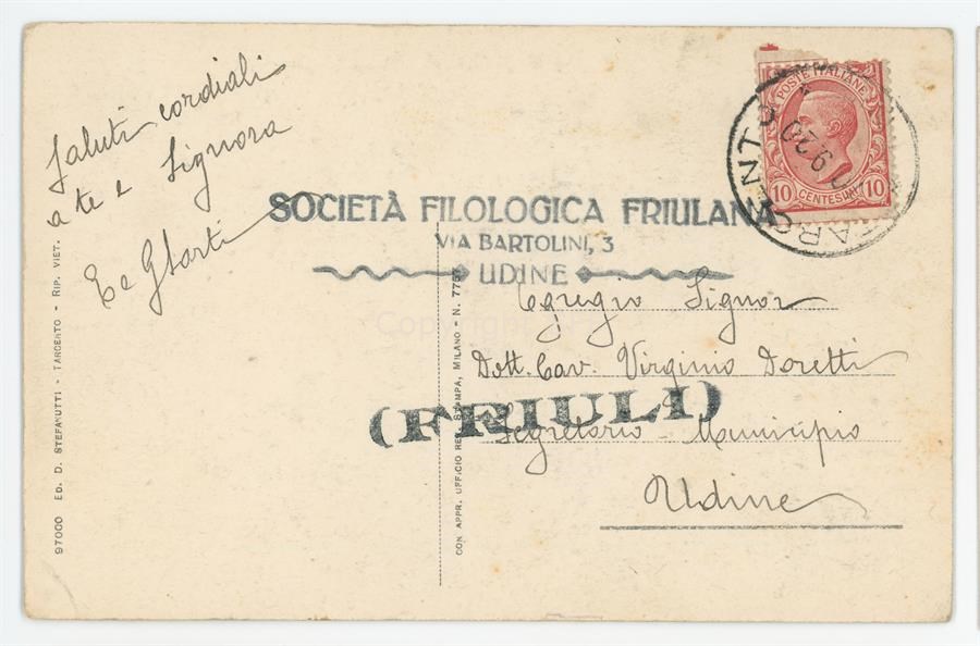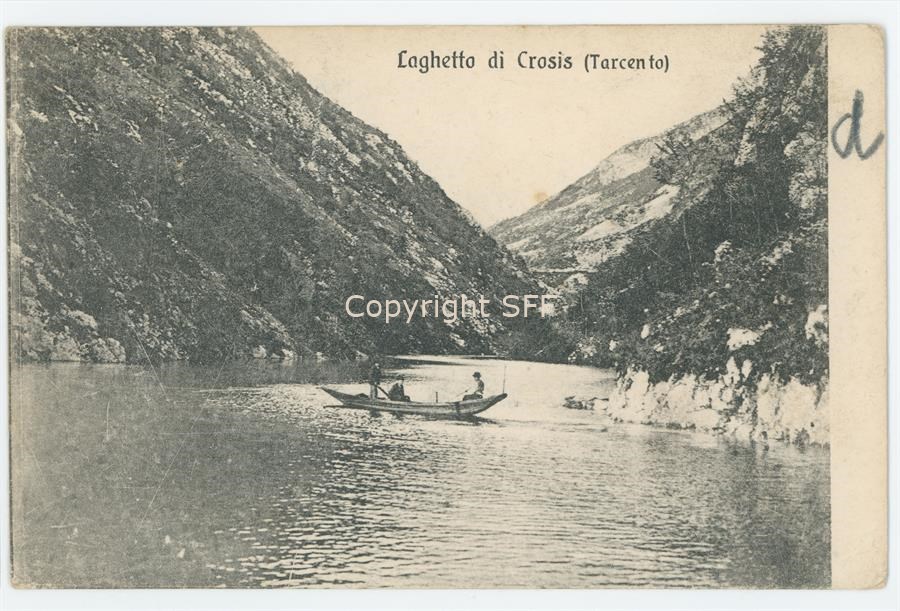 Cartolina viaggiata. Veduta di un ansa del torrente Torre che crea uno specchio d'acqua attraversato da una imbarcazione a remi condotta da tre uomini. Nei pressi del così detto "laghetto" di Crosis Arturo Malignani, inventore e imprenditore friulano, nel 1898 avviò la costruzione di una diga a regimentare le acque del torrente Torre per impiegarle a scopi industriali. L'impianto idroelettrico avrebbe dovuto fornire energia elettrica alla linea tramviaria che collegava Tarcento con Udine. La diga, quando era ancora in costruzione, fu venduta al cascamificio di Bulfons a Tarcento realtà industriale in forte crescita.